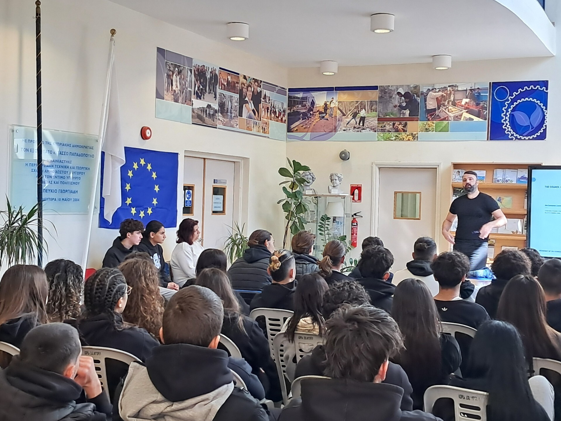 Την Τρίτη, 3 Φεβρουαρίου 2026, είχαμε τη χαρά να υποδεχτούμε στο σχολείο μας τον κ. Κωνσταντίνο Κακούρο, στο πλαίσιο ενημέρωσης σχετικά με τα θεσμικά όργανα της Ευρωπαϊκής Ένωσης, τον θεσμό της Προεδρίας του Συμβουλίου της και τις προτεραιότητες της Κυπριακής Προεδρίας. Οι μαθητές και οι μαθήτριές μας παρακολούθησαν με ιδιαίτερο ενδιαφέρον τη διάλεξη και συμμετείχαν σε έναν γόνιμο διάλογο με τον προσκεκλημένο μας, θέτοντας ερωτήματα και εκφράζοντας προβληματισμούς γύρω από σύγχρονα ζητήματα της επικαιρότητας.