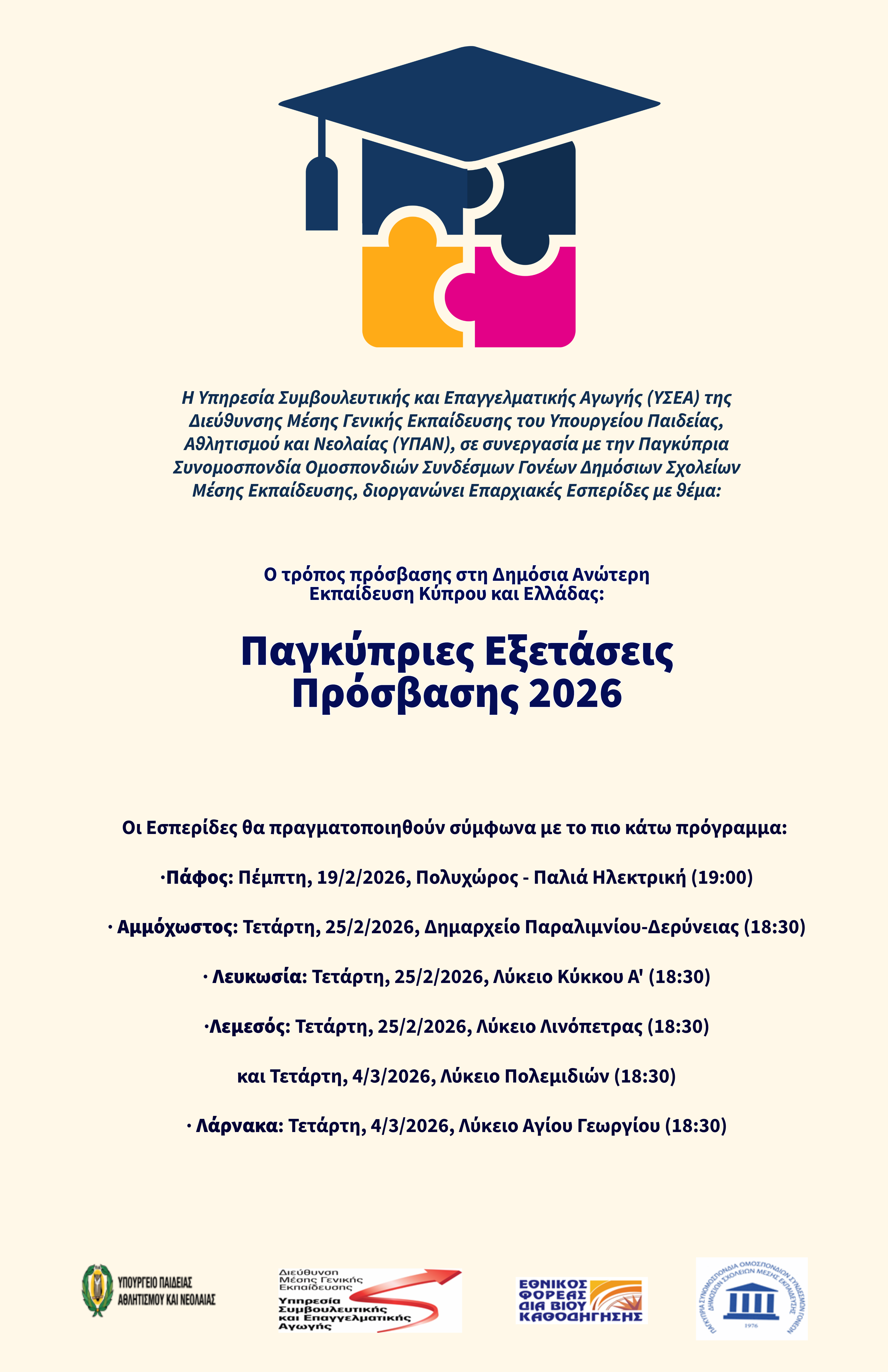 - Επαρχιακές Εσπερίδες Επαγγελματικής Συμβουλευτικής «Ο τρόπος πρόσβασης στη Δημόσια Τριτοβάθμια Εκπαίδευση Κύπρου και Ελλάδας - Παγκύπριες Εξετάσεις Πρόσβασης 2025»
